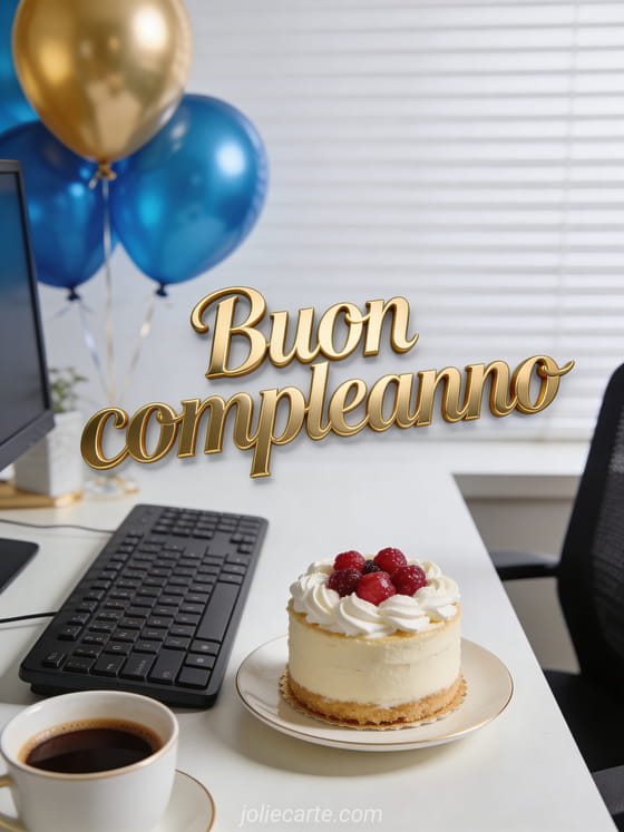 Invia un messaggio allegro di compleanno a un collega di lavoro con una scena da ufficio curata, una piccola torta, caffè e palloncini blu e oro. Puoi anche condividere un buon compleanno capo per un altro augurio professionale.