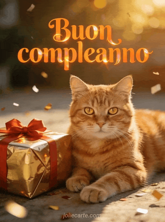 Condividi dolcezza con questo biglietto di compleanno con gatto rosso fotorealistico vicino a un regalo dorato e luce morbida del tramonto. Scopri anche buon compleanno 365 giorni di felicità, buon compleanno disegno colore e parole di buon compleanno.