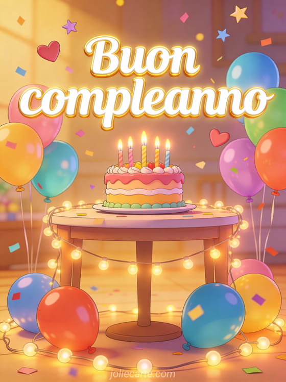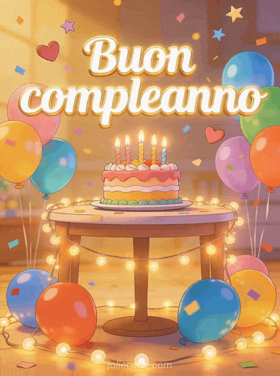 Festeggia con una cartolina di buon compleanno piena di torta colorata, candele, palloncini e coriandoli volanti in luce dorata calda. Scopri anche sms per augurare buon compleanno, lettera di buon compleanno e compleanno auguri.