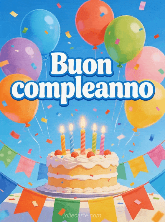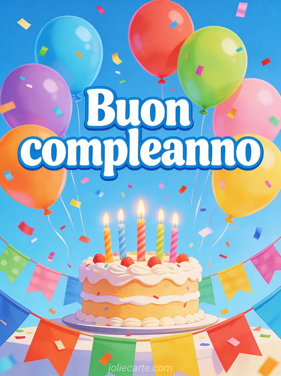 Condividi questo vivace biglietto di buon compleanno su Facebook con palloncini colorati e coriandoli festosi. Scopri anche un biglietto buon compleanno babysitter o un biglietto augurare buon compleanno.