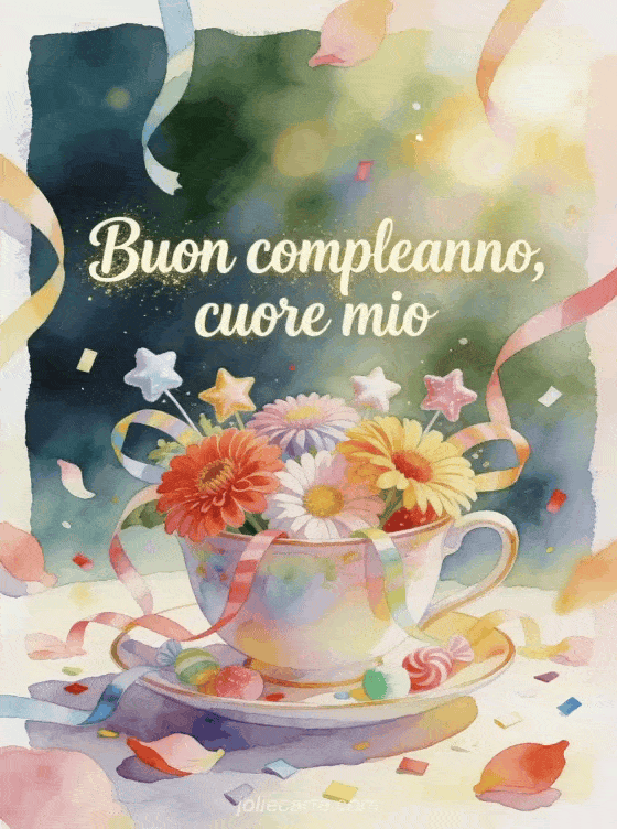 Augura al tuo cuore un compleanno luminoso con un biglietto in acquerello che mostra una grande tazza traboccante di zinnie, stelle di zucchero, nastri di compleanno, petali e coriandoli in una scena color caramella. Personalizzalo online e invialo gratis. Scopri anche cuore buon compleanno cuore, buon compleanno cuore mio immagini o buon compleanno amore mio.