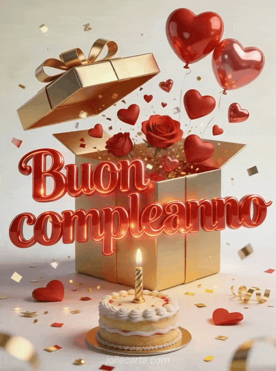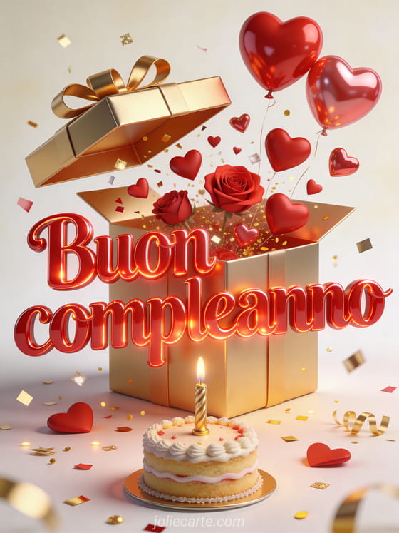 Invia un biglietto di compleanno gioioso e romantico con scritte rosse lucide, cuori 3D che escono da una scatola regalo dorata, palloncini a cuore e una piccola torta con candela. Coriandoli e glitter rendono la scena luminosa e festosa. Scopri anche buon compleanno cuore mio immagine, cuore buon compleanno cuore o buon compleanno cuore mio immagini.