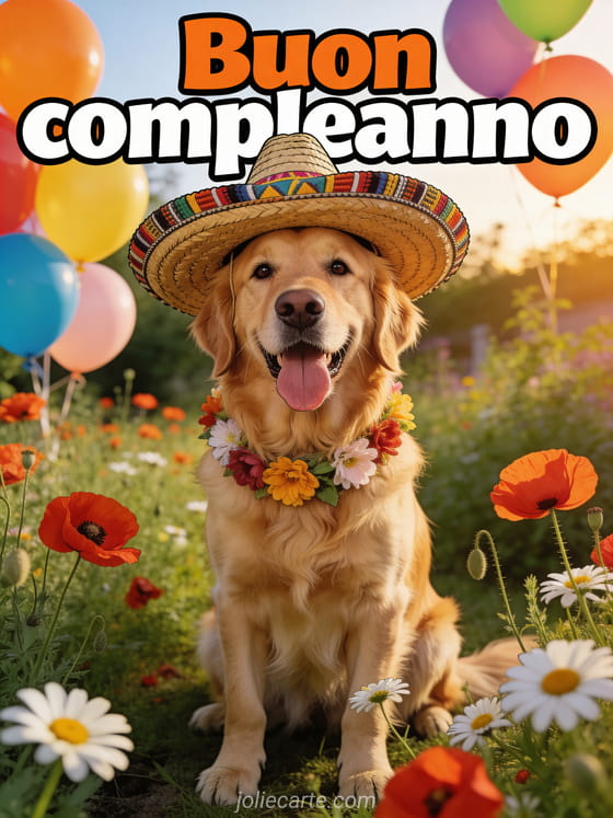 Invia questo divertente biglietto di buon compleanno con cane — un golden retriever fotorealistico con sombrero messicano e collare di fiori in un giardino di papaveri e margherite. Scopri anche un gif divertente di buon compleanno o un gif animato divertente di buon compleanno.