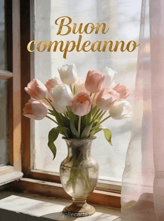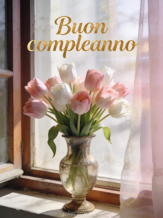Condividi una cartolina di compleanno delicata con un bellissimo bouquet di tulipani e un'atmosfera luminosa. Scopri anche compleanno donna immagine, messaggio biglietto compleanno donna e bel testo compleanno donna.