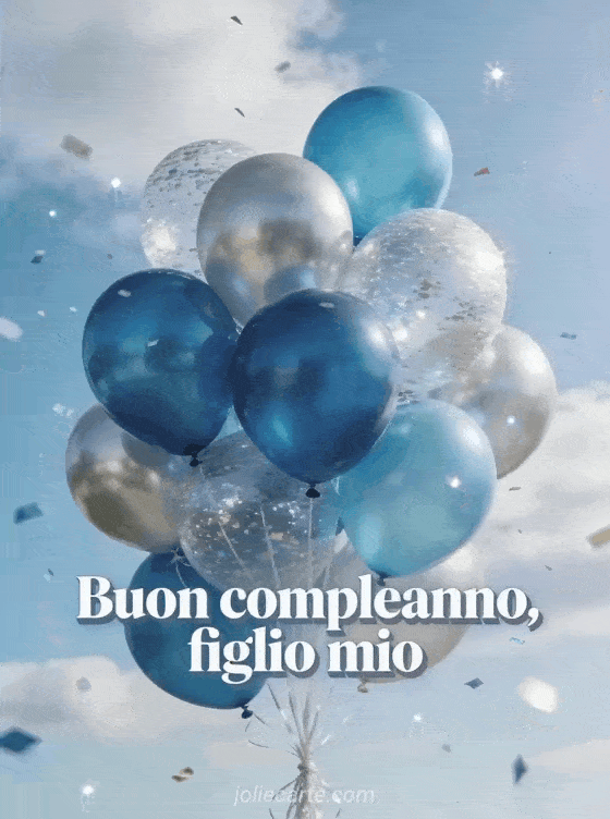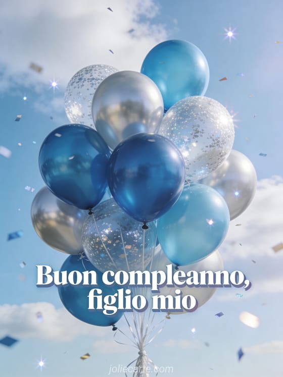Festeggia tuo figlio con un biglietto fotorealistico di compleanno con palloncini blu e argento che fluttuano in un cielo luminoso, coriandoli scintillanti e nuvole leggere. Scopri anche un buon compleanno divertente figlio mio, un testo di compleanno per mio figlio o un buon compleanno mio figlio citazione.