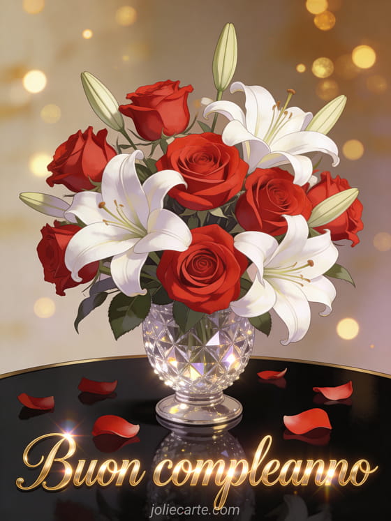 Festeggia un compleanno speciale con questo splendido biglietto con un magnifico arrangiamento di rose rosse e gigli bianchi in un vaso di cristallo, petali sparsi e luci bokeh dorate. Scopri anche un gif musicale di buon compleanno o un biglietto di compleanno con fiori di campo.