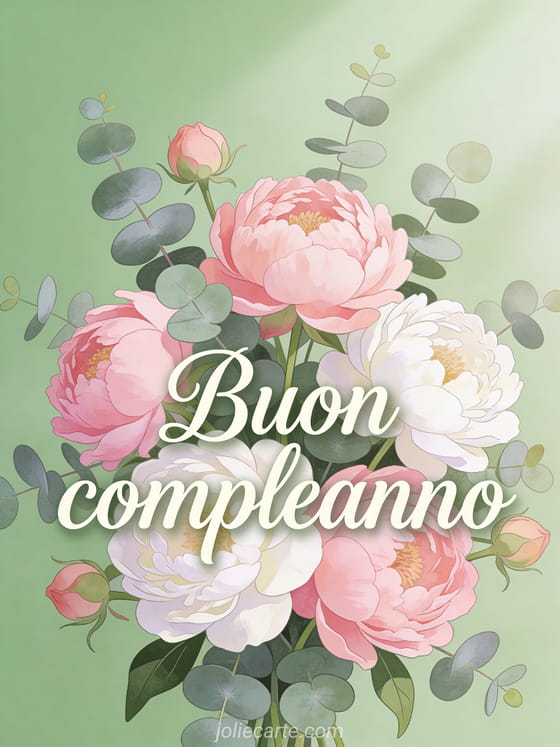 Invia questo biglietto di buon compleanno con fiori — una composizione lussuosa di peonie rosa e bianche e foglie di eucalipto in una morbida luce naturale. Scopri anche gif di buon compleanno o un biglietto di buon compleanno.