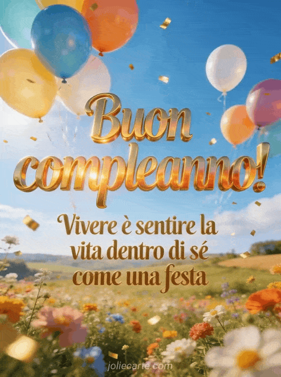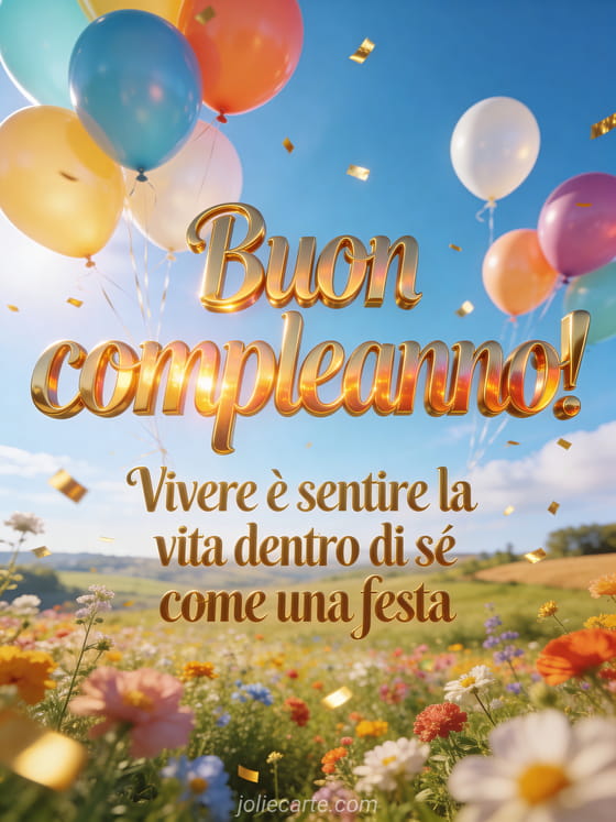 Invia un bellissimo augurio di buon compleanno con una frase vibrante sulla vita. Palloncini colorati che volano su un paesaggio fiorito creano la perfetta atmosfera festiva. Scopri anche buon compleanno vita sonno amore sogno o un breve messaggio per augurare buon compleanno.