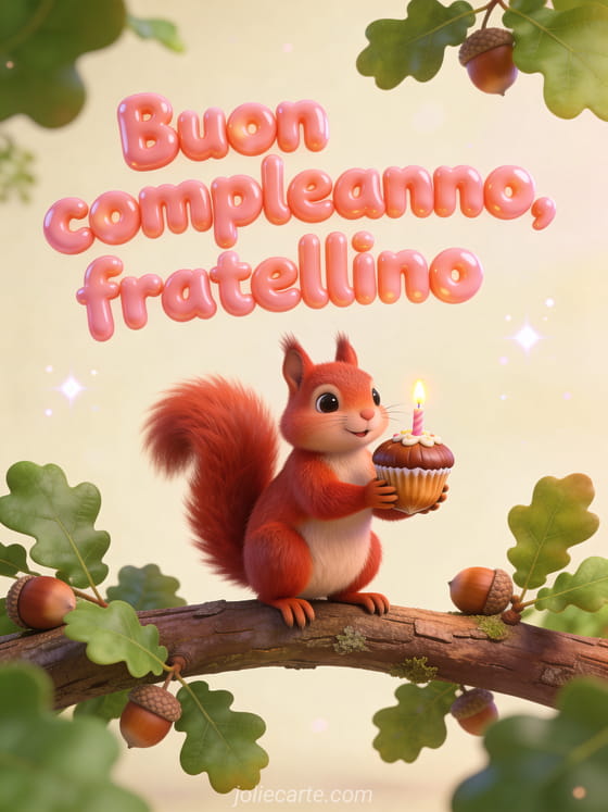 Invia un biglietto giocoso di compleanno con uno scoiattolo rosso che tiene una nocciola decorata come un mini cupcake, appollaiato su un ramo di quercia. Puoi condividere anche un compleanno fratellino, un compleanno fratello o un buon compleanno fratellone mio.