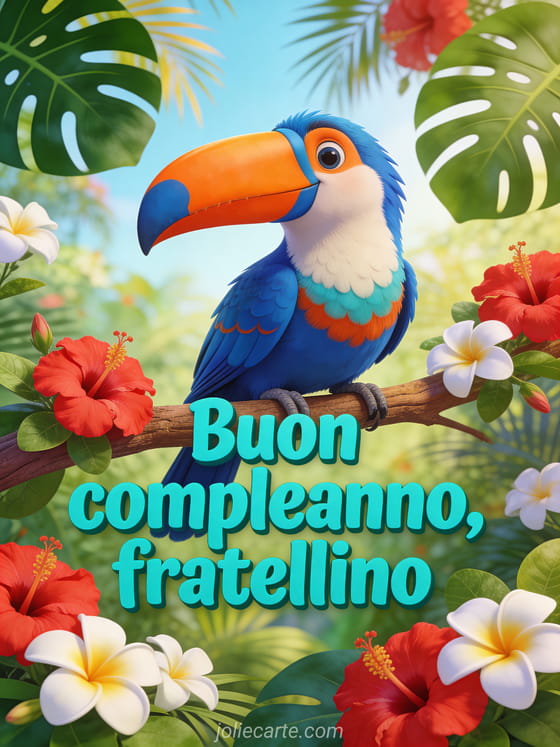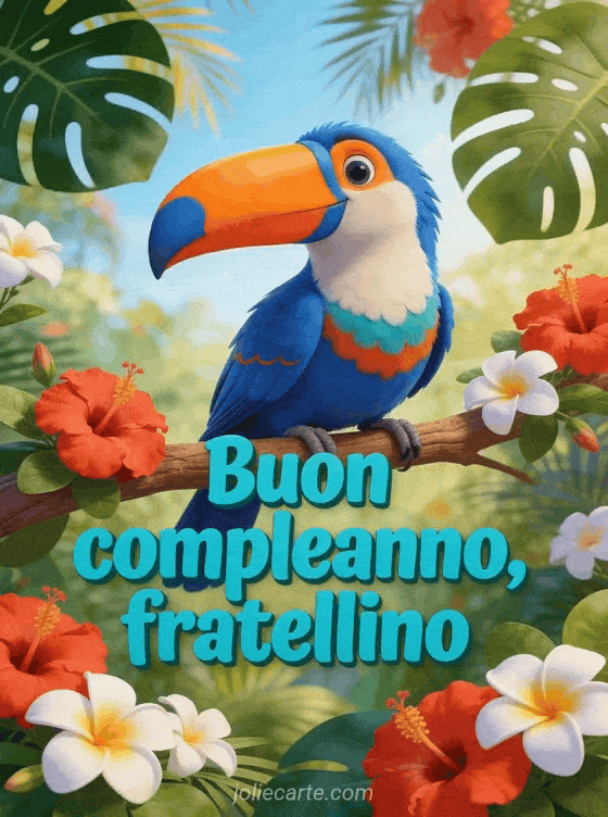 Festeggia il tuo fratellino con un tucano colorato posato su un ramo tropicale, circondato da ibischi rossi, frangipani bianchi e foglie giganti di monstera. Puoi condividere anche un compleanno mio fratello, un buon compleanno mio fratello gif o un fratellino buon compleanno mio fratello gif.