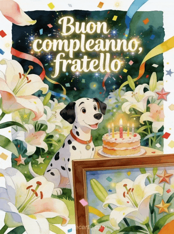 Invia a tuo fratello un augurio di compleanno pieno di gioia, con un dalmata giocoso, coriandoli luminosi e una torta con candeline. Scopri anche sms buon compleanno a suo fratello maggiore, buon compleanno mio fratellino sms o immagine buon compleanno fratellino.