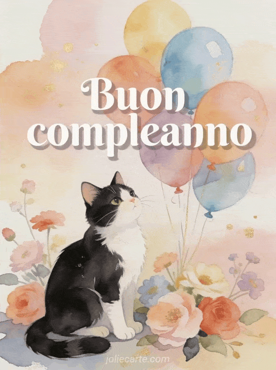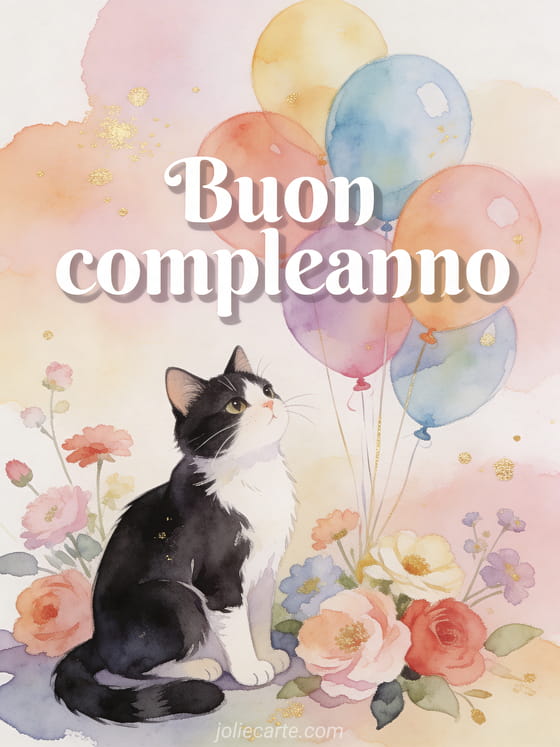 Condividi un'atmosfera di compleanno dolce con questa illustrazione ad acquerello di un gatto bianco e nero, fiori, tonalità pastello e palloncini. Scopri anche buon compleanno con gatto rosso, buon compleanno 365 giorni di felicità e compleanno auguri gruppo.