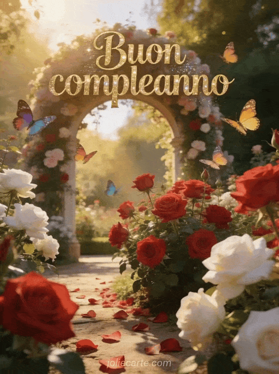 Invia questo splendido gif animato di buon compleanno con un giardino di rose rosse e bianche, farfalle colorate e luce dorata del tramonto. Una cartolina gratuita perfetta per lei. Scopri anche buon compleanno animato mazzo di fiori o buon compleanno gatto gif animata gratis.