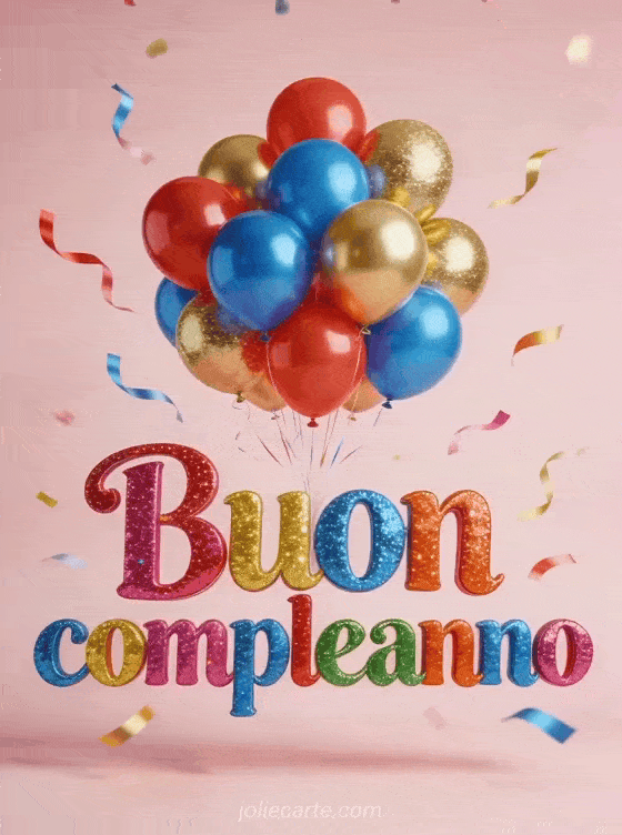 Invia questo festivo gif di buon compleanno con lettere multicolori con glitter, una cascata di palloncini e nastri che volano. Scopri anche il gif buon compleanno o il biglietto buon compleanno.