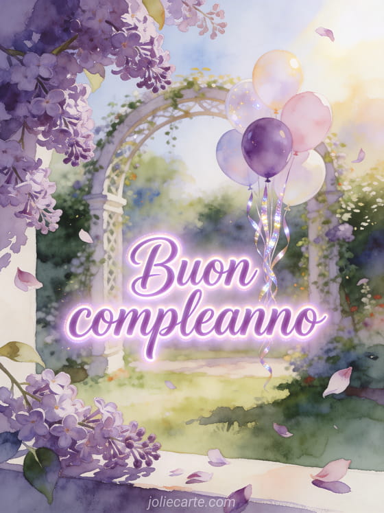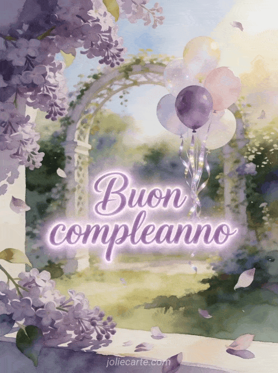 Condividi un augurio grazioso di compleanno con scrittura lavanda luminosa, grappoli profumati di lillà, petali sospesi, un arco da giardino, un mazzo di palloncini e stelle filanti scintillanti nella luce pastello del sole. Puoi inviare anche un buon compleanno mamma immagine animata, auguri di compleanno per mamma o un buon compleanno mamma gif scintillante.