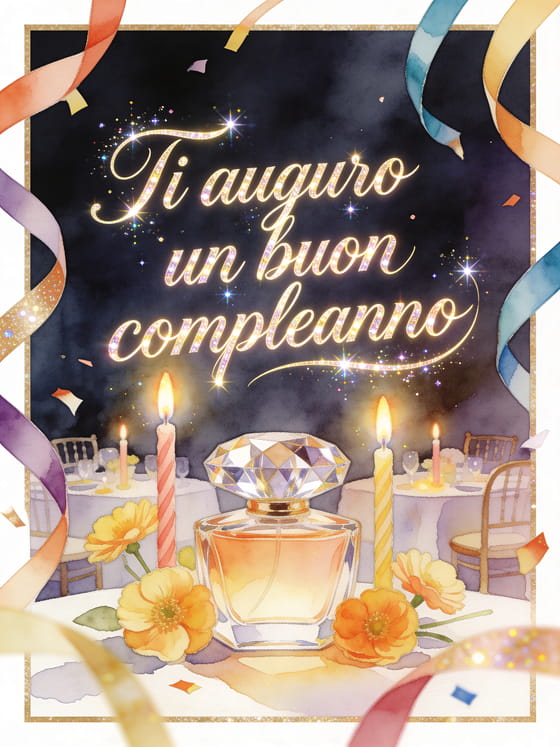 Augura un buon compleanno con un biglietto glamour in acquerello con flacone di profumo sfaccettato, nastri color gioiello, candele luminose e ranuncoli che attraversano il bordo. Personalizza questo saluto radioso online e invialo gratis. Scopri anche buon compleanno cuore, un buon compleanno cuore mio immagine o cuore buon compleanno cuore.