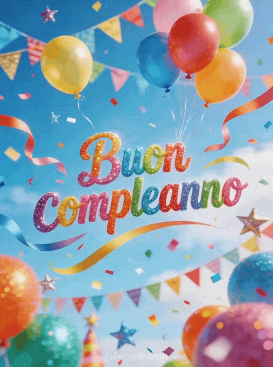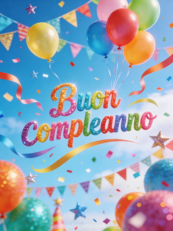 Condividi un augurio luminoso di compleanno con lettere multicolori glitterate, palloncini colorati che salgono nel cielo blu, nastri ondulati, coriandoli, festoni con bandierine e stelle. Puoi inviare anche un buon compleanno mamma biglietto, un buon compleanno biglietto per una giovane mamma o buon compleanno mamma immagini.