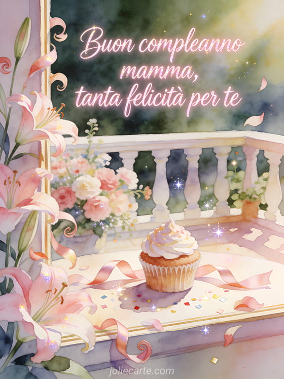 Condividi un augurio radioso di compleanno per la mamma con calligrafia rosa tenue, gigli alti, petali arricciati, un cupcake glassato, nastri di seta, coriandoli scintillanti e una terrazza fiorita elegante. Puoi inviare anche un buon compleanno mamma gif, un buon compleanno giovane mamma biglietto o un buon compleanno mamma immagine animata.