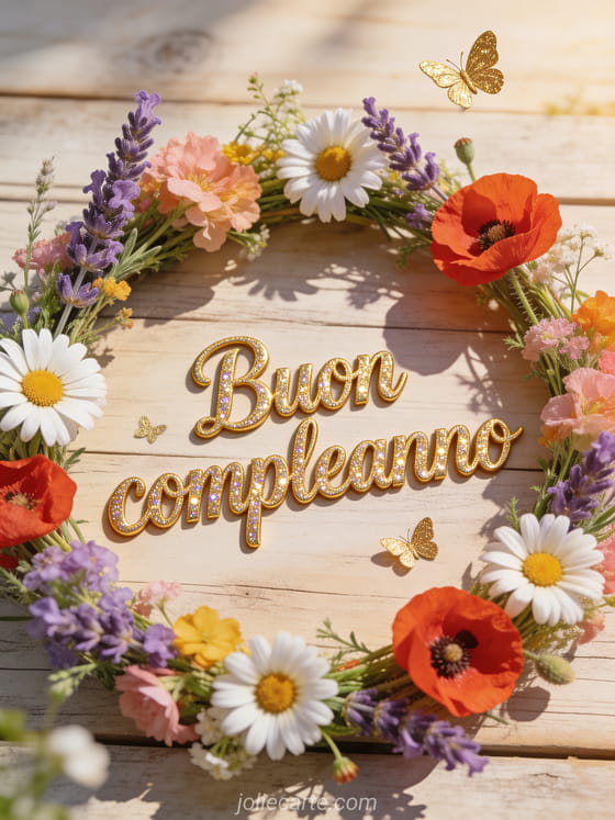 Condividi un augurio caldo di compleanno con lettere dorate glitterate, una corona colorata di fiori selvatici con margherite, lavanda e papaveri, sfondo di legno chiaro, luce naturale e piccole farfalle dorate. Puoi inviare anche un buon compleanno biglietto per una giovane mamma, buon compleanno mamma immagini o un biglietto di compleanno mamma ti voglio bene.