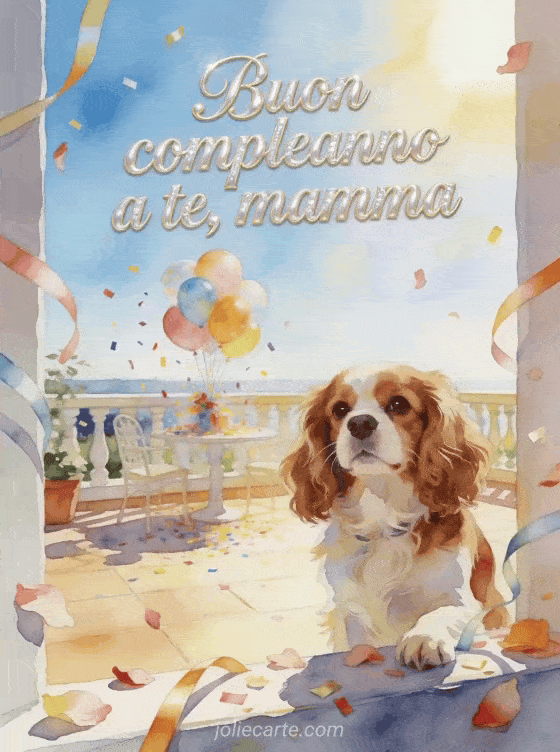 Condividi un desiderio gioioso di compleanno per la mamma con calligrafia perlata, un cane Cavalier King Charles, petali, stelle filanti, palloncini e coriandoli su una terrazza al sole. Puoi inviare anche un testo per dire buon compleanno alla propria mamma, una gif animata buon compleanno mamma gif o un buon compleanno mamma testo semplice.