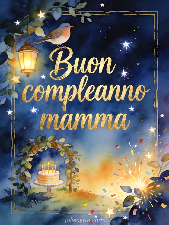 Condividi un augurio luminoso di compleanno per la mamma con scrittura dorata a pennello, un usignolo, una lanterna accesa, una piccola torta, stelline e coriandoli brillanti in un pergolato frondoso al crepuscolo. Puoi inviare anche un buon compleanno mamma testo di compleanno, un buon compleanno mamma gif o un compleanno giovane mamma gif.