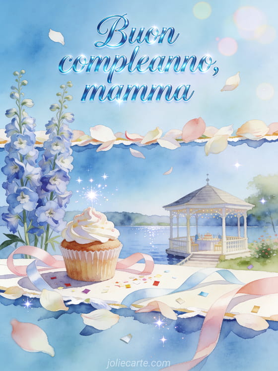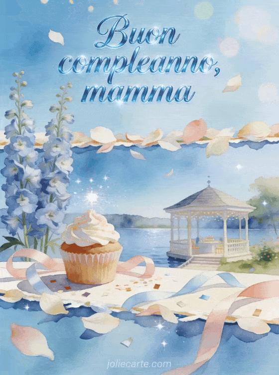 Condividi un augurio tranquillo di compleanno per la mamma con calligrafia azzurro cielo, alti delfini, un gazebo sul lago, un cupcake glassato, nastri pastello e coriandoli scintillanti. Puoi inviare anche un compleanno giovane mamma gif, un buon compleanno mamma ti voglio bene immagine o un immagine di compleanno per mamma.