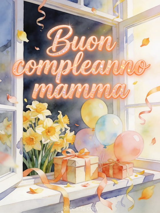 Condividi un augurio luminoso di compleanno per la mamma con calligrafia pesca, glitter delicato, narcisi, scatole regalo con nastri, palloncini pastello, petali e nastri arricciati su un davanzale luminoso. Puoi inviare anche un buon compleanno mamma biglietto animato, un buon compleanno mamma gif o un buon compleanno giovane mamma biglietto.