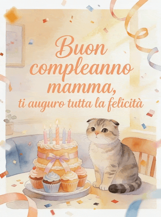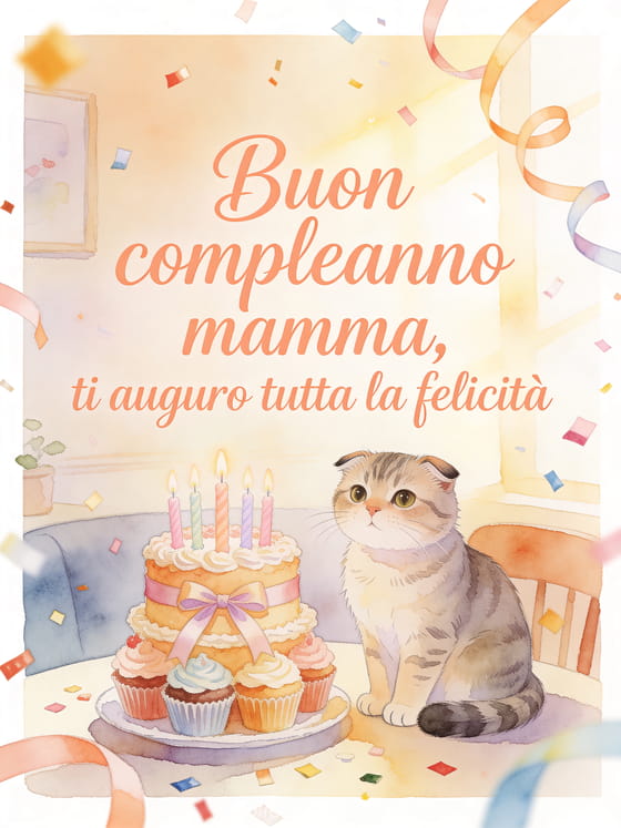 Invia alla mamma un messaggio caloroso di compleanno con scrittura color pesca, una luce soffusa e una scena allegra ad acquerello sul tavolo. Puoi condividere anche un buon compleanno suocera testo, un biglietto buon compleanno mamma gratis o un buon compleanno mamma testo.