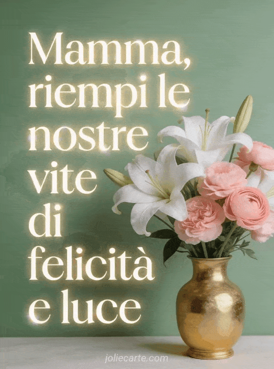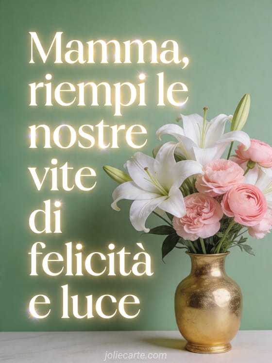 Invia alla tua mamma un affettuoso messaggio di compleanno con questo elegante biglietto con gigli bianchi e ranuncoli rosa in un vaso dorato su un delicato sfondo verde salvia. Scopri anche biglietto buon compleanno mamma, messaggio compleanno mamma e biglietto compleanno mamma.