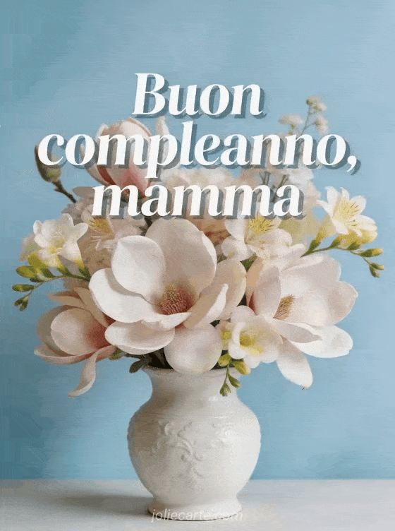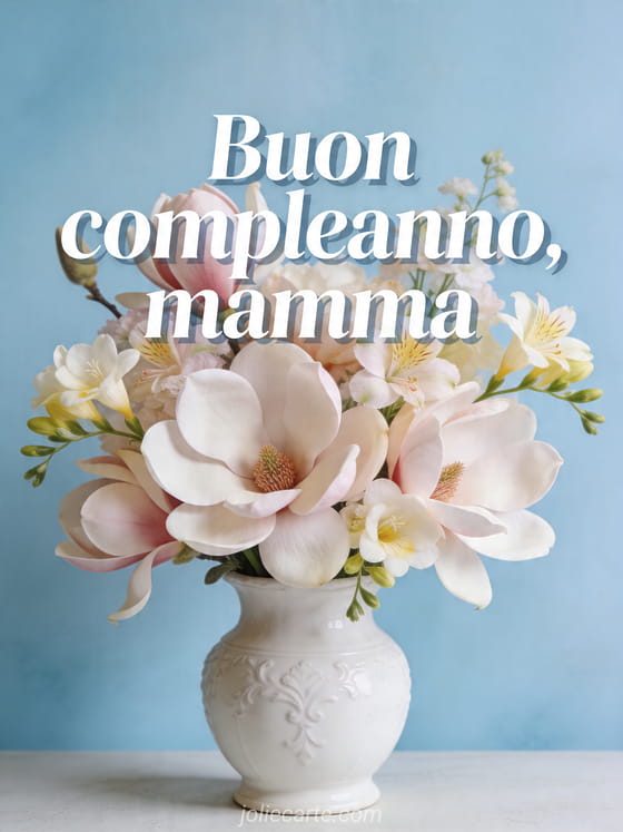 Condividi un affettuoso augurio di compleanno per la tua mamma con questo delicato biglietto floreale con magnolie e fresie in un vaso bianco di porcellana. Scopri anche testo compleanno mamma commovente, disegno compleanno mamma e biglietto commovente buon compleanno mamma.