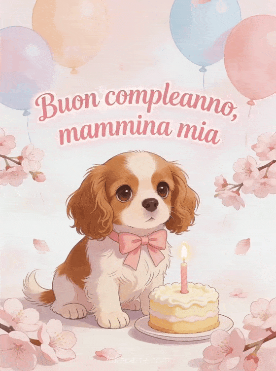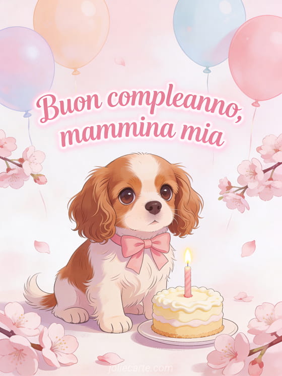 Condividi un saluto tenero di compleanno per la mamma con un dolce cucciolo Cavalier King Charles, un fiocco rosa, una torta con candela, fiori di ciliegio e morbidi palloncini pastello. Puoi inviare anche un biglietto di buon compleanno mamma disegno, un biglietto di breve messaggio di compleanno per mamma o un biglietto di biglietto di buon compleanno per mamma.