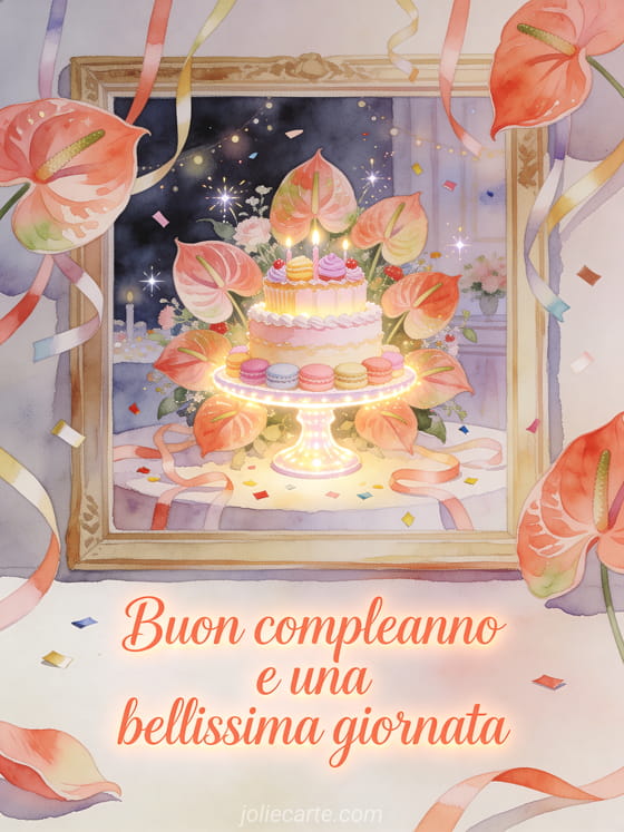 Invia un biglietto luminoso di compleanno in acquerello con anturi, un'alzata per torta illuminata, dolci pastello, nastri e coriandoli scintillanti. Puoi condividere anche un buon compleanno alla sua capa, un messaggio di compleanno collega di lavoro o un buon compleanno da una collega di lavoro.