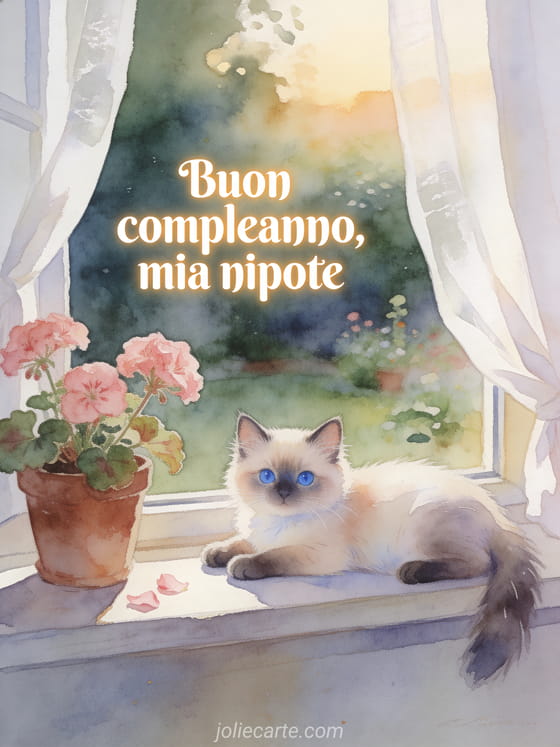 Condividi un delicato biglietto di compleanno per tua nipote con un adorabile gatto ragdoll dagli occhi azzurri disteso su un davanzale, accanto a gerani rosa e tende leggere. Scopri anche un buon compleanno a mia nipote, un altro buon compleanno alla mia nipotina o un compleanno per mia nipote.