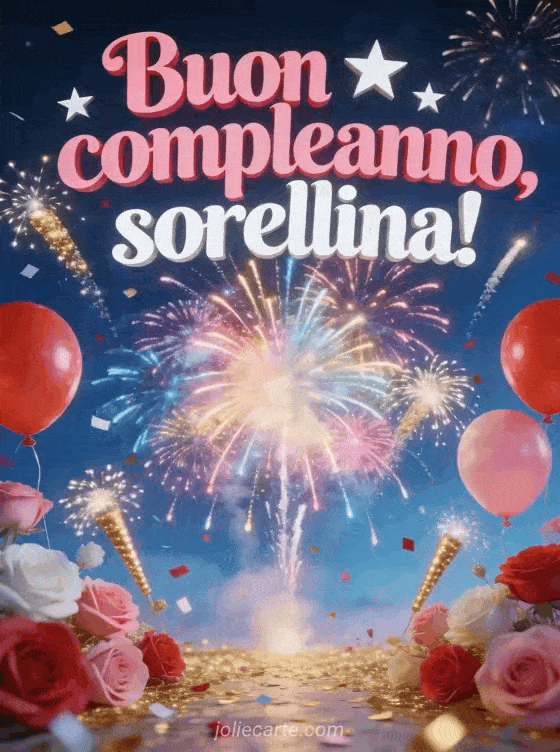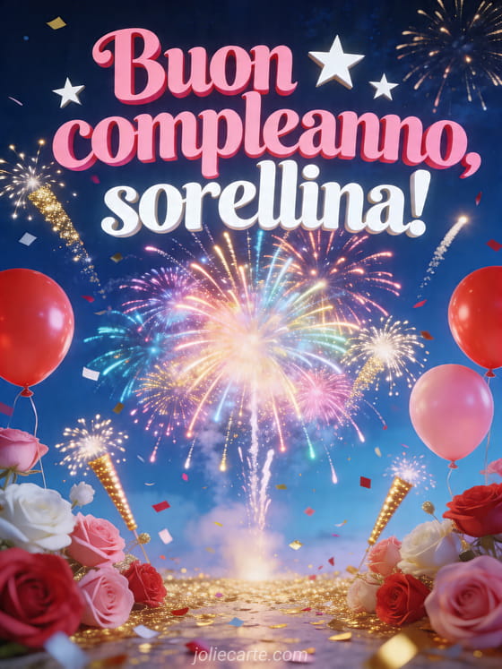 Festeggia la tua sorellina con questa spettacolare cartolina di compleanno con fuochi d'artificio colorati, palloncini, coriandoli e cielo notturno luminoso. Puoi anche scoprire compleanno di una sorella, compleanno mia sorella o biglietto buon compleanno sorella grande.