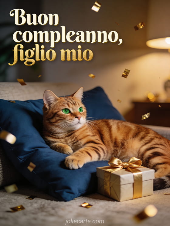 Invia un augurio di compleanno tenero a tuo figlio adulto con una scena fotorealistica calda. Un gatto tigrato rosso riposa su un cuscino blu navy accanto a un piccolo regalo incartato, mentre i coriandoli dorati aggiungono una luce festiva. Scopri anche un biglietto compleanno figlio adulto gratis, una poesia di una madre al figlio per il suo compleanno o un biglietto figlio mio biglietto compleanno figlio adulto.