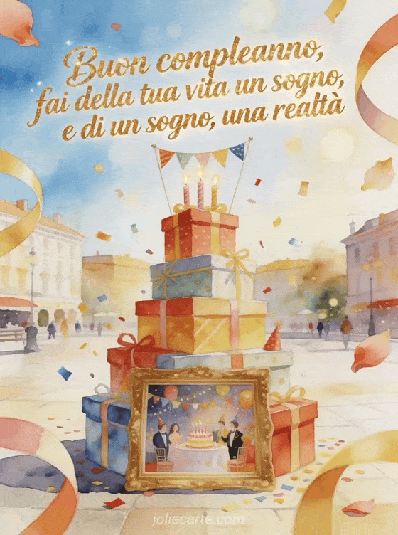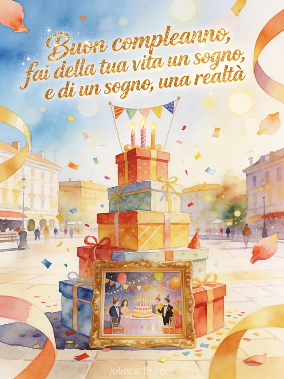 Invia un biglietto di compleanno ispiratore con una luminosa festa ad acquerello intorno a un'alta torre di regali, candele, ghirlande e coriandoli sospesi. Il messaggio invita tuo figlio a fare della vita un sogno e di un sogno una realtà. Scopri anche un compleanno per un figlio o un buon compleanno mio ometto.