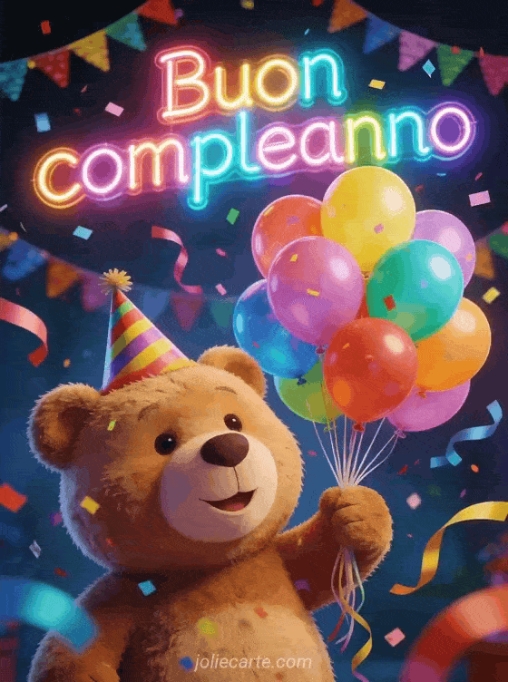 Condividi un biglietto luminoso di compleanno con un orsacchiotto gigante che indossa un cappello da festa e tiene palloncini colorati, circondato da coriandoli, stelle filanti e ghirlande festose. Scopri anche un biglietto di compleanno per mio figlio, un buon compleanno figlio gif o un buon compleanno bambino gif.