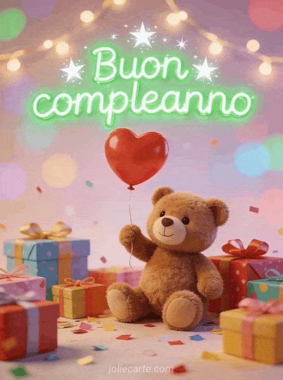 Condividi un dolce biglietto di compleanno con un piccolo orsetto marrone che tiene un palloncino rosso a forma di cuore, circondato da regali colorati, coriandoli e ghirlande luminose su un fondo pastello con bokeh. Puoi inviare anche un biglietto di compleanno per un fratello, un fratellino buon compleanno mio fratello gif o un buon compleanno fratellino gif.