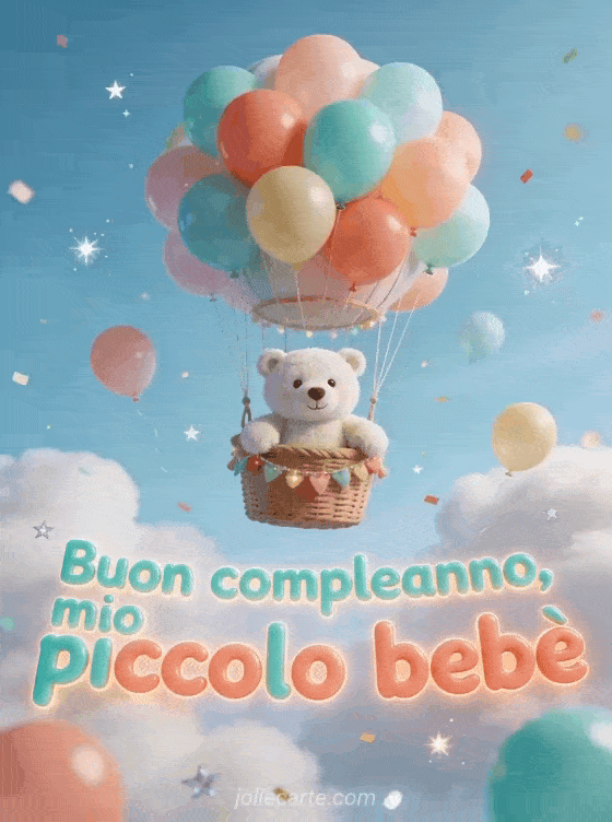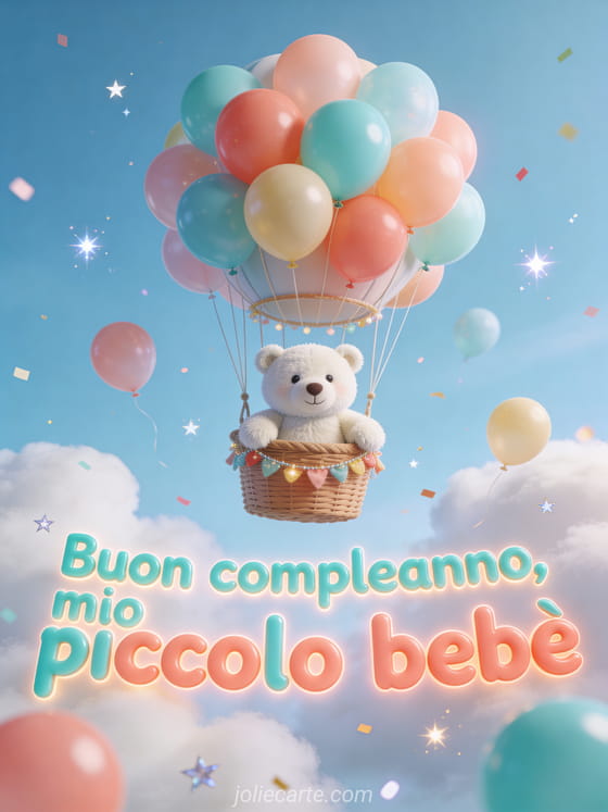 Festeggia il tuo piccolo bebè con un biglietto di compleanno sognante che mostra un orso polare di peluche seduto in una cesta di mongolfiera, circondato da palloncini rotondi colorati, nuvole soffici, stelle scintillanti e coriandoli leggeri. Scopri anche buon compleanno cuccioli di animali, testo compleanno bimbo 1 anno o bebè augura buon compleanno.