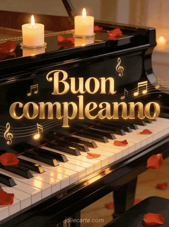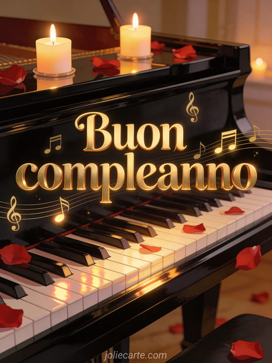 Festeggia con un biglietto di compleanno raffinato con pianoforte a coda lucido, candele accese, petali di rosa rossa e luce soffusa. Scopri anche buon compleanno immagini, buon compleanno gatto e biglietto buon compleanno rosa.