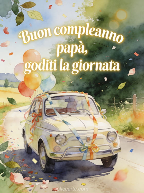 Condividi buon compleanno papĂ con auto in una scena con un'auto d'epoca decorata con nastri e palloncini di compleanno su una strada assolata di campagna. Puoi scegliere anche buon compleanno papĂ calligrafia, ti voglio bene buon compleanno papĂ o compleanno di papĂ .