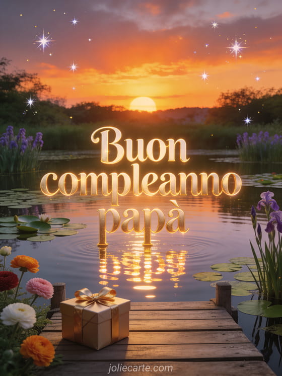 Invia un biglietto virtuale di buon compleanno papĂ con lettere dorate, un laghetto tranquillo con ninfee e iris, un tramonto acceso e un regalo incartato su un pontile di legno. Scopri anche un buon compleanno papĂ biglietto, un testo di compleanno per il suo papĂ o un divertente buon compleanno papĂ spiritoso.
