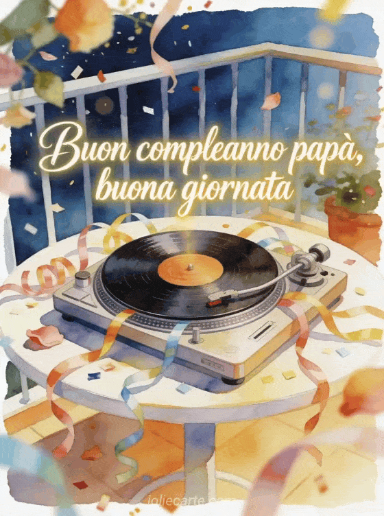 Condividi buon compleanno papĂ in calligrafia con un tavolo da terrazza ad acquerello, un giradischi in movimento e stelle filanti di compleanno. Puoi scegliere anche ti voglio bene buon compleanno papĂ , compleanno di papĂ o disegno compleanno papĂ .