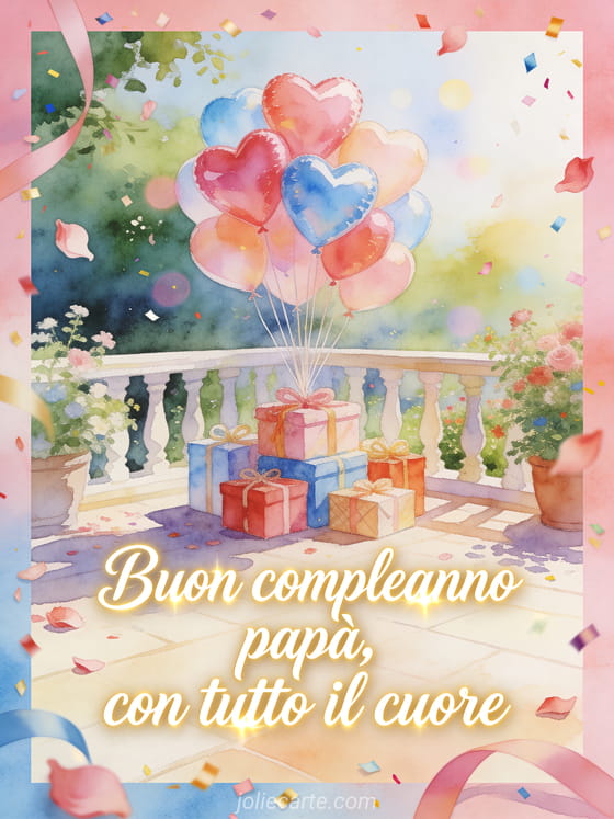Condividi buon compleanno papĂ cuore con un mazzo di palloncini a forma di cuore che sale sopra regali incartati su una luminosa terrazza in giardino. Puoi scegliere anche buon compleanno papĂ auto, buon compleanno papĂ calligrafia o ti voglio bene buon compleanno papĂ .