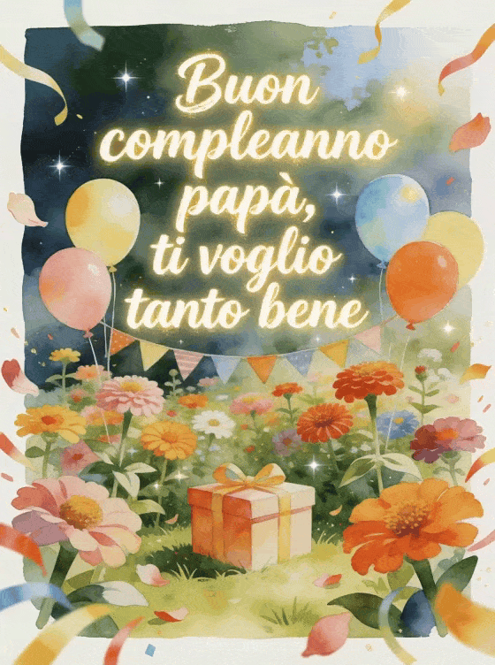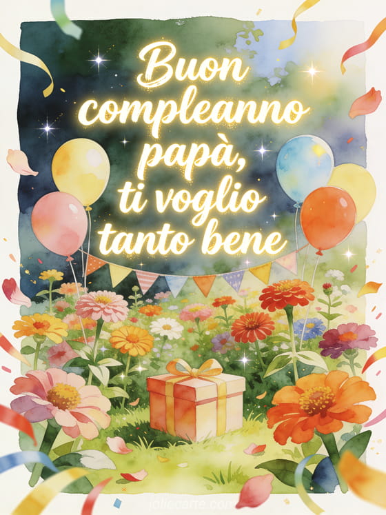 Condividi una poesia da bambino di buon compleanno papĂ con un giardino luminoso di zinnie, palloncini di compleanno, bandierine e una scatola regalo al centro. Puoi scegliere anche poesia di buon compleanno per il mio papĂ , poesia d'amore per papĂ per il suo compleanno o biglietto di compleanno per papĂ .