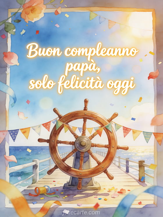 Condividi buon compleanno papĂ semplice con una ruota di nave circondata da festoni di compleanno su un molo soleggiato, nella luce marina ad acquerello. Puoi scegliere anche buon compleanno papĂ cuore, buon compleanno papĂ auto o buon compleanno papĂ calligrafia.