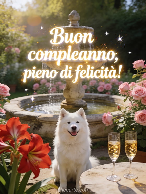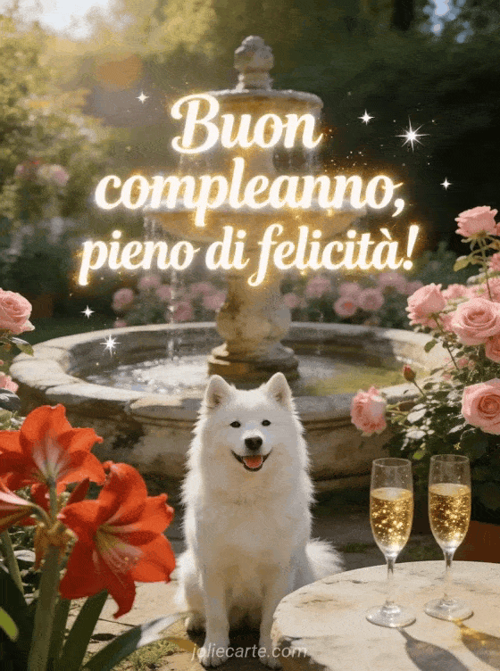 Festeggia con un biglietto radioso di compleanno con Samoiedo bianco sorridente, fontana antica, rose fresche, amarilli rossi e bicchieri di champagne scintillanti. Scopri anche ti auguriamo un buon compleanno, buon compleanno gatto carino e buon compleanno gif carino.