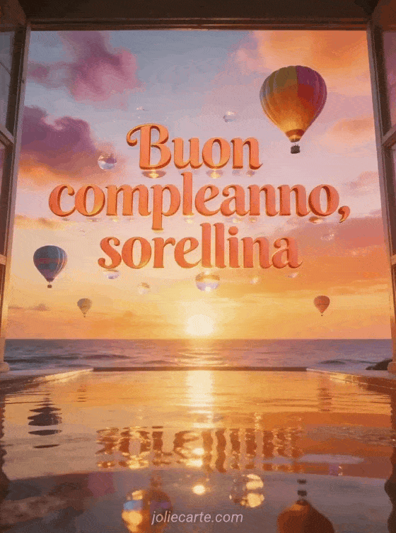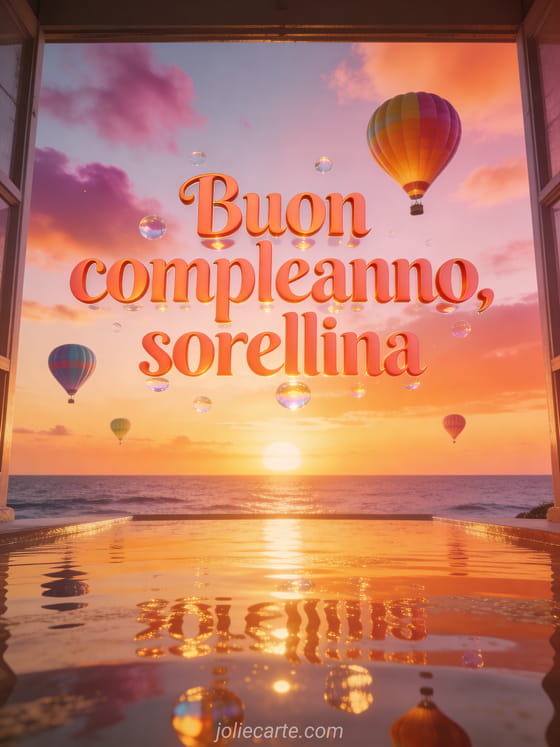 Di' a tua sorella quanto è speciale con questa mozzafiato cartolina di compleanno. Un tramonto marino spettacolare con mongolfiere colorate che fluttuano in un cielo arancione e rosa, riflessi dorati sull'acqua calma e nuvole tinte di malva. Scopri anche un testo biglietto compleanno sorella o un biglietto di compleanno donna sorella.