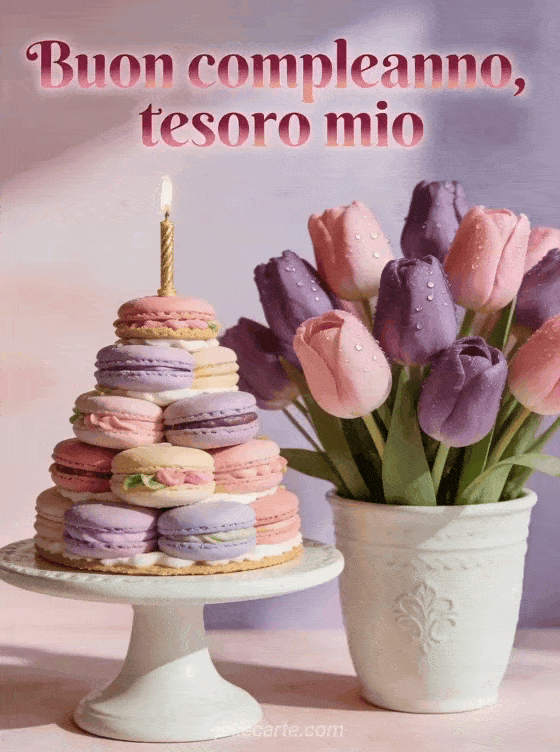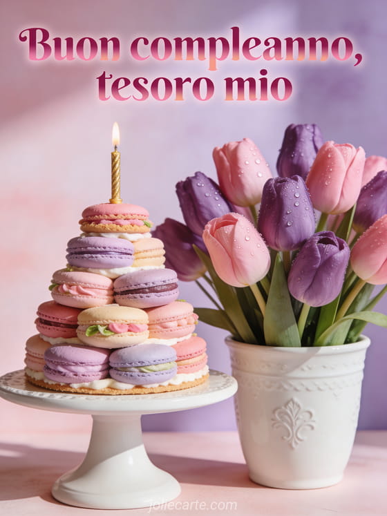 Invia un augurio di compleanno tenero e romantico con un bouquet fotorealistico di tulipani rosa e viola in un vaso di ceramica bianca. Una torre di macaron pastello con candela dorata diventa la torta di compleanno in una scena morbida ed elegante. Scopri anche buon compleanno tesoro mio, compleanno romantico o buon compleanno amore mio gif.