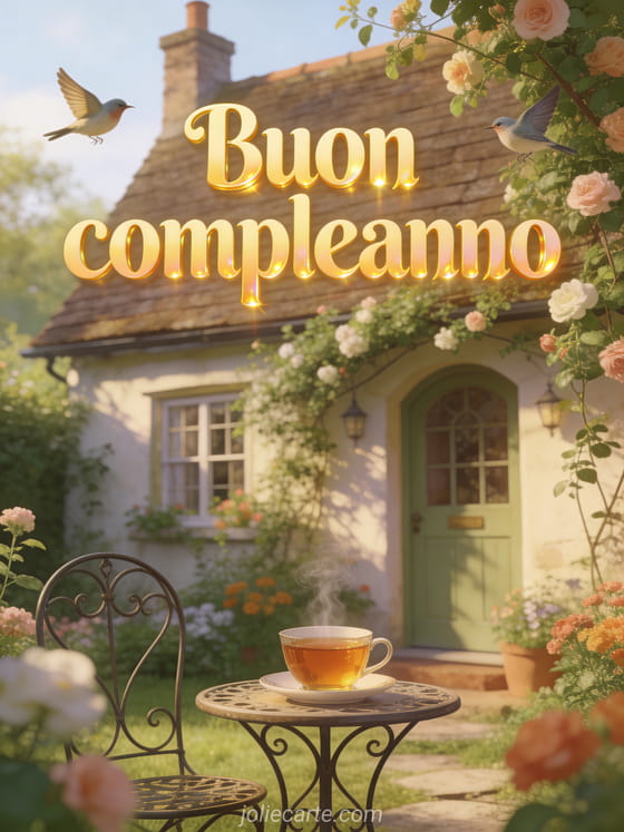Condividi un buon compleanno tranquillo con una cartolina di fiori, paesaggio campestre e tazza di tè fumante in luce dorata morbida. Scopri anche buon compleanno con mascherina coronavirus, sms per augurare buon compleanno e compleanno auguri minimalisti.